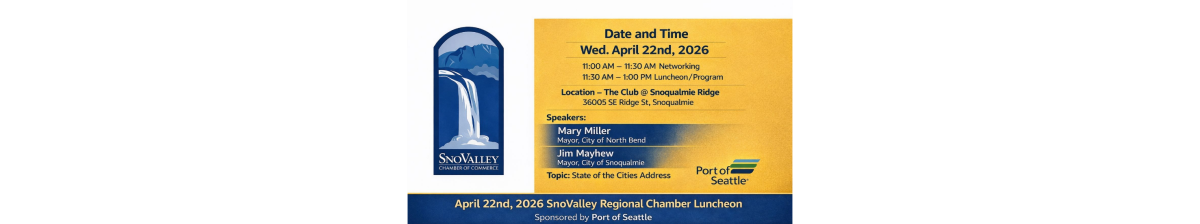 Join us for the Snoqualmie Valley Chamber Luncheon as we welcome North Bend Mayor Mary Miller and Snoqualmie Mayor Jim Mayhew for the annual State of the Cities Address. Hear firsthand updates on key initiatives, economic development, and priorities shaping our communities in 2026. This popular luncheon offers valuable insight into the future of the Snoqualmie Valley—and a great opportunity to connect with local business and civic leaders.