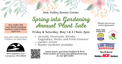 Celebrate the season and get your garden growing at the Sno-Valley Senior Center’s beloved annual “Spring Into Gardening” Plant Sale, happening Friday, May 1 and Saturday, May 2 from 9:00 a.m. to 3:00 p.m. at the Sno-Valley Senior Center (4610 Stephens Ave, just behind City Hall).