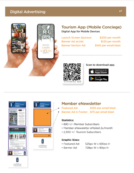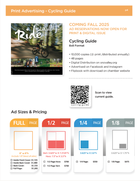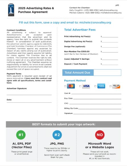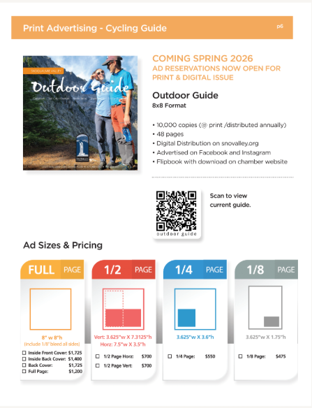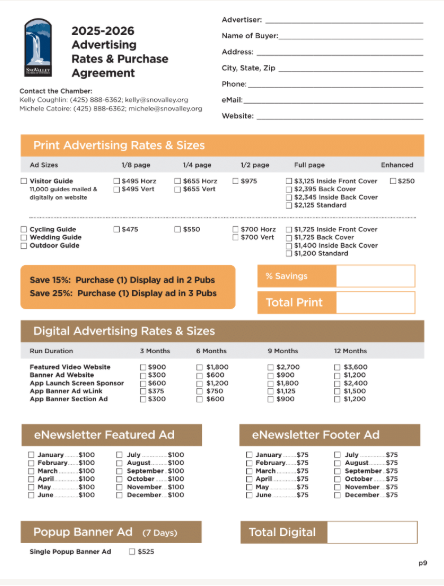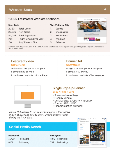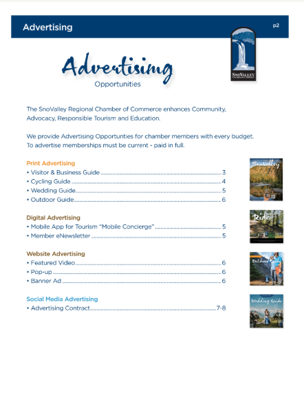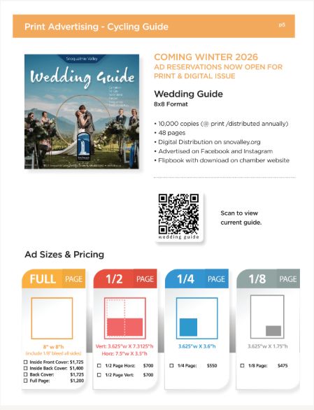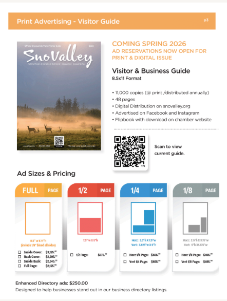 Shopping cart (0) You have no items in your shopping cart. Home page New products Search My account Top / 2026 Media Kit 2026 Media Kit Advertise in all our local guides. All are print and digital. You will not want to miss this great opportunity to place your advertisement in the 2026 - 2027 Snoqualmie Valley Guides and other sources. (This project is for our Chamber of Commerce businesses and is not affiliated with the residential guide that is being done by the for-profit Snoqualmie Valley Record) It is exciting to know that we have been putting out an informative and quality guide for over 40 years. In this edition each chamber member will be listed in the business section both alphabetically and by category. You can also highlight your business by advertising in this popular guide. We will be distributing over 30,000 magazines to our Snoqualmie residents, and to local businesses for you to give to your customers. Along with that the guide will be discoverable online through heavy digital marketing. Our past guides have received over 300,000 impressions and over 198,000 downloads. Here’s to an incredible 2026! Full Page Full page Advertisement 8.5"w x 11"h (include 1/8 bleed all sides) Gets 1 full month banner ad on app! Design Fees are extra. $2,125.00 Qty: Half Page Advertisement Half Page Advertisement in 2021 Community Guide 7.5" w x 5" h Design Fee's are extra $975.00 Qty: 1/4 Page Horizontal Advertising 1/4 Page Advertising Horizontal 2.5"h x 7.5"w Design Fees are not included $655.00 Qty: 1/4 Page Vertical Advertisement 1/4 Page Vertical Advertisement 3.625"w x 5"h Design Fee's are additional $655.00 Qty: Copy of 1/4 Page Horizontal Advertisement 1/4 Page Vertical Advertisement 3.625"w x 5"h Design Fee's are additional $655.00 Qty: Copy of 1/4 Page Vertical Advertisement 1/4 Page Vertical Advertisement 3.625"w x 5"h Design Fee's are additional $655.00 Qty: 1/8 Page Advertisement 1/8 Advertisement 2.5"h x 3.75"w Design Fee's are extra. $495.00 Qty: Enhance Directory Ad Help your business stand out in the Category Listings. Add bold company Name, 25 word description, photo and/or logo, plus website address. $250.00 Qty: